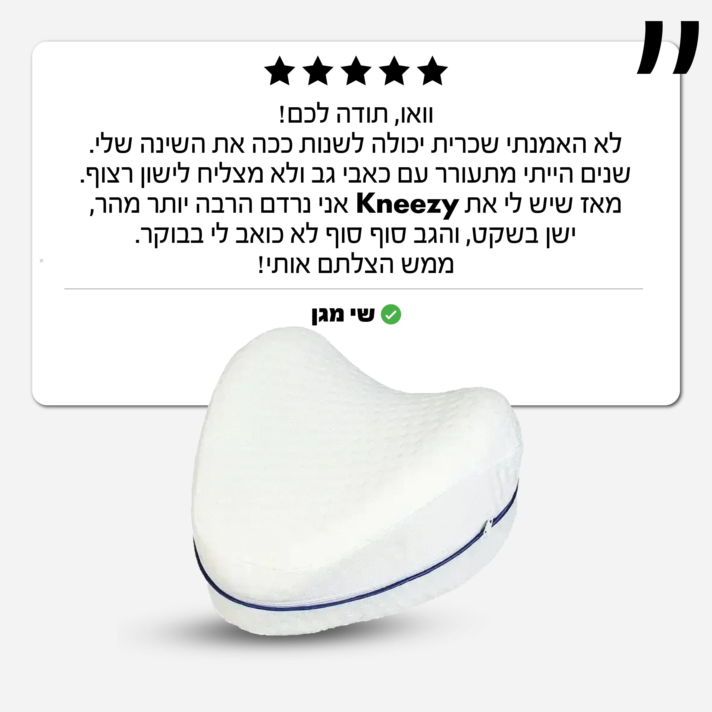 Kneezy™ ממוקמת בין הברכיים בזמן השינה, שומרת על יישור נכון של עמוד השדרה, האגן והרגליים, ומפחיתה לחצים וכאבים. הקצף הויסקו-אלסטי מתאים את עצמו לגוף ותומך בדיוק איפה שצריך – לשינה בריאה ונוחה יותר.